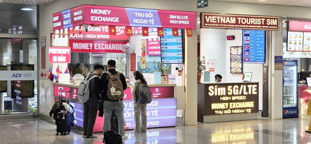 En los aeropuertos suele haber cajeros de bancos vietnamitas como Vietcombank, Agribank, Vietinbank, Techcombank o VIB. Son bancos habituales y puedes sacar sin problema, aunque la mayoría aplican una pequeña comisión por retirada (normalmente entre 20.000 y 50.000 VND / aprox. 0,7–1,5 €).