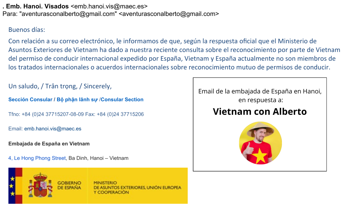 Fuentes y referencias: Convención de Viena sobre circulación vial (1968) , Convención de Ginebra sobre circulación vial (1949), Circular 29/2015/TT-BGTVT del Ministerio de Transporte de Vietnam (reconocimiento del permiso internacional de conducir de 1968), E-mail de la embajada de España en Vietnam